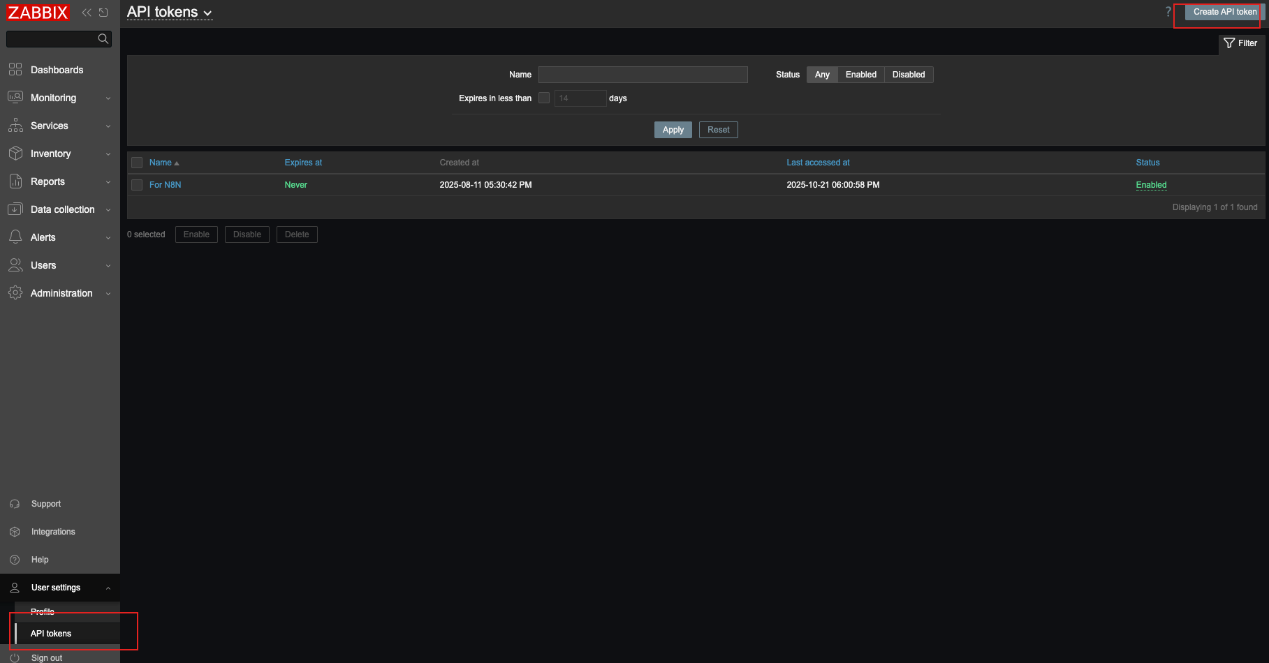 在Zabbix console的左下角有一个User settings, 选第二个API tokens
