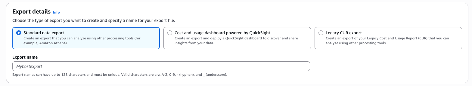 | 功能点 | Standard Data Export | Cost & Usage Dashboard | Legacy CUR Export |