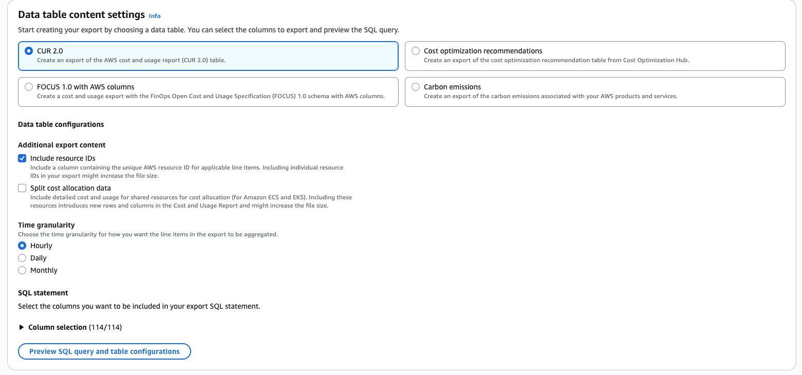 | 技术底层 | CUR 2.0 (SQL-based) | CUR 2.0 + QuickSight | Legacy CUR (旧) |